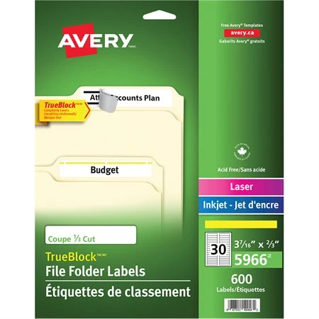 Avery Étiquettes De Classement TrueBlock™ Paquet De 600, 20 Feuilles. Blanc