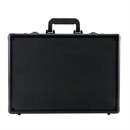 Fini métal noir et accents en aluminium. Section ajustable matelassée pour portable de 17,3 po. Intérieur rembourré. Section pour dossier réglable avec compartiment pour tablette. Serrures à combinaison. 18 x 5 x 13 po H. Noir.