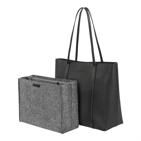 Cuir végétalien. Fermeture à glissière sur le dessus. Intérieur en feutre, amovible avec pochette pour l’ordinateur comprenant une pochette pour ordinateur portable, jusqu’à 14 po. Pochette extérieure à fermeture éclair, facile d’accès qui cache une Courroie pour l’accrochage à la poignée télescopique d’une valise. 15 x 13,25 x 6,25 po.