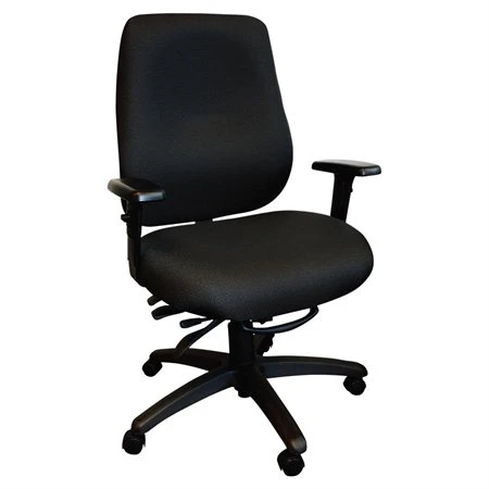 Dossier moyen à basculements multiples. Conçu pour les applications quarts multiples (sept jours par semaine; trois quarts par jour) et fabriqué avec des éléments haut rendement. La capacité nominale active maximale pour ces modèles haut rendement est de 400 lbs. Réglage de la hauteur du siège. Réglage de la profondeur du siège. Réglage de l’angle et de la hauteur du dossier. Contrôle de la tension du basculement avec blocage multiple. Accoudoirs à hauteur et largeur réglable. Coussins en biomousse à haute densité moulée par injection. Noir.