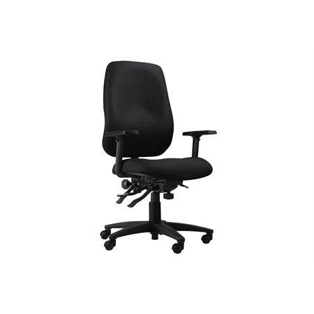 Fauteuil à dossier moyen. Assise standard. Largeur de l’assise de 20 pouces et du dossier de 19 pouces. Mécanisme multifonction avec siège coulissant. Réglage de la hauteur et de la profondeur du siège. Réglage de l’angle avant du siège. Réglage de l’angle et de la hauteur du dossier. Basculement avec contrôle de la tension et blocage multiple du siège. Siège et dossier faits de bio-mousse par injection, moulés, à haute densité.