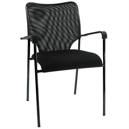 Dossier profilé maillé avec siège rembourré en mousse à haute densité et résilience. Base à quatre pieds. Accoudoirs en polypropylène moulé par injection. Empilable jusqu’à 5 chaises de hauteur. Noir.