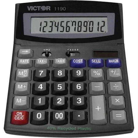 Affichage surdimensionné et inclinable de 12 chiffres. Touches coûtant/vendant/marge/Taxes. Mémoire à 3 touches. 6 décimales. Alimentation solaire et à pile. Contient 40% de plastique recyclé. Garantie de 2 ans. 5-7/8 x 7-3/4 x 1 ».